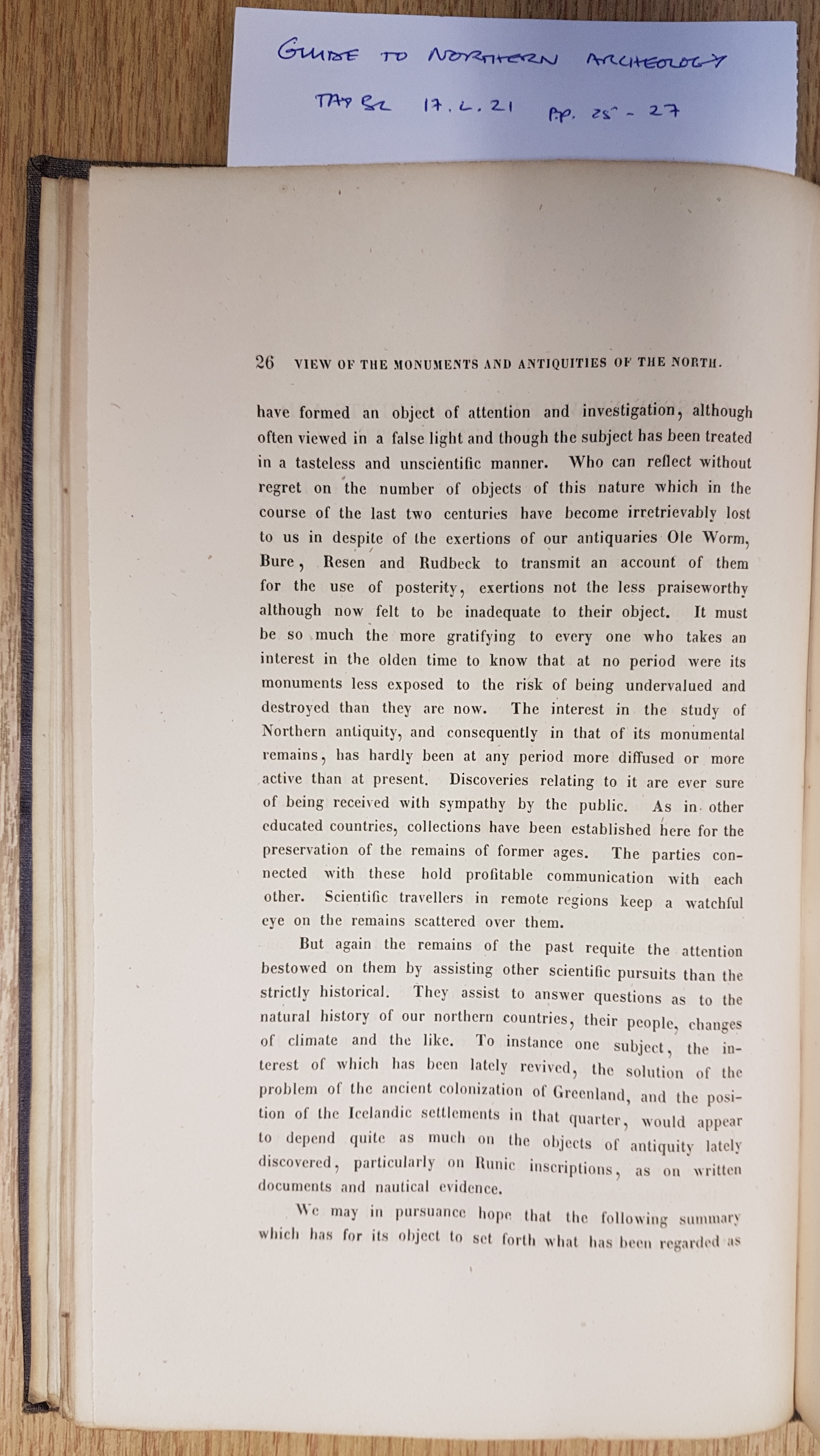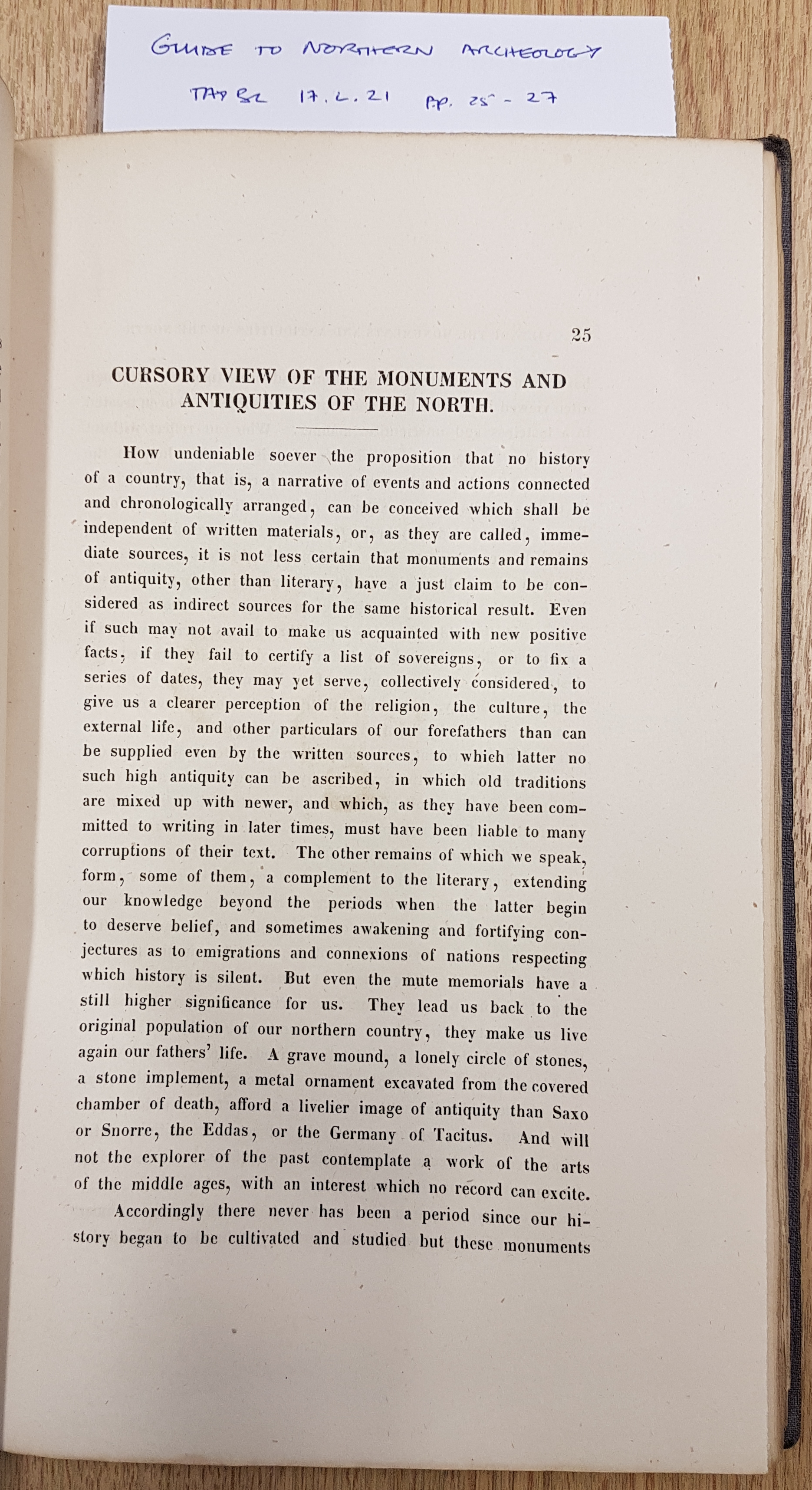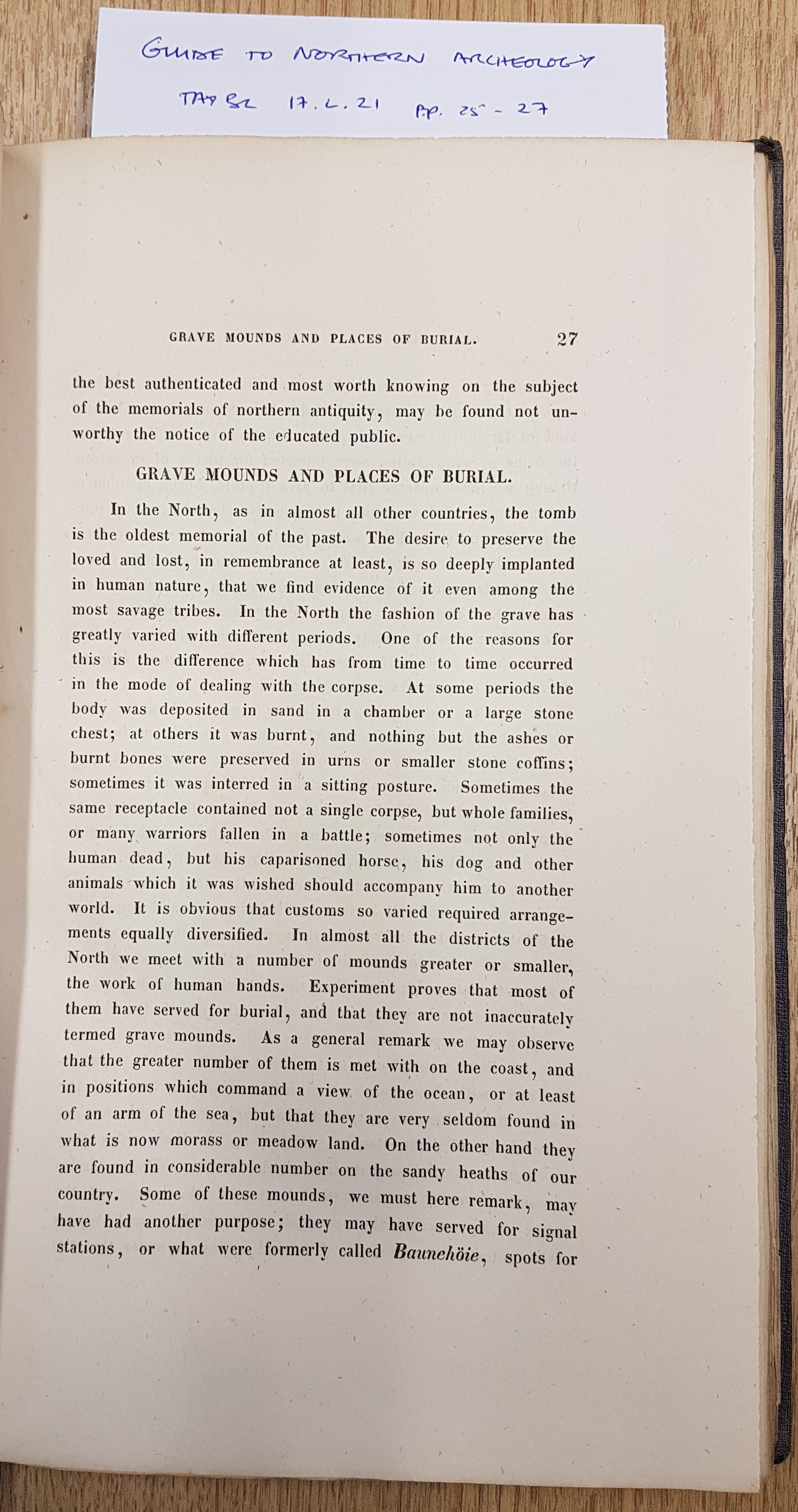- This dataset was created during the Taylor Institution Library course 'DIY Digital Editions' in Hilary 2018. The course showcases works from the library's collections and trains participants in Digital Humanities skills. Digital editions are made available for reuse and enrichment on http://editions.mml.ox.ac.uk. Text file created in xml using TEI encodings and images taken on a Samsung Galaxy S7 Edge. Excerpt from Guide to Northern Archæology / by the Royal Society of Northern Antiquaries of Copenhagen ; edited for the use of English readers by the Earl of Ellesmere. (Taylor Institution Library 17.L.21). The book contains translation of Ledetraad til Nordisk Oldkyndighed (1836) by Danish antiquarian Christian Jürgensen Thomsen (1788-1865), which sets out his system of dating archaeological artifacts by reference to co-occurrence and archaeological context, including ancient literature. Taylor Institution Library copy inscribed: ‘Presented to the Taylor Institution by the Earl of Ellesmere February 19.1852’.
