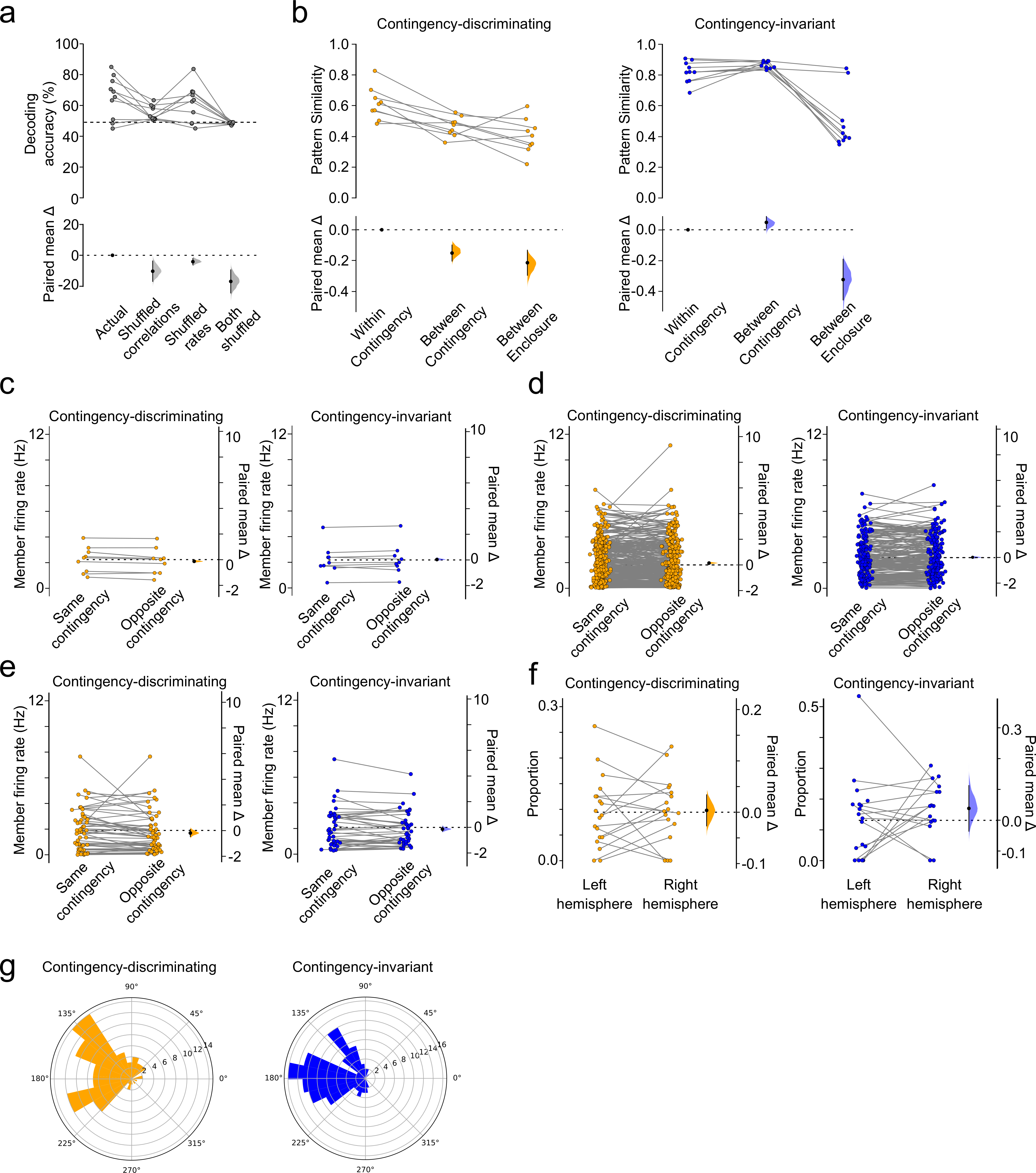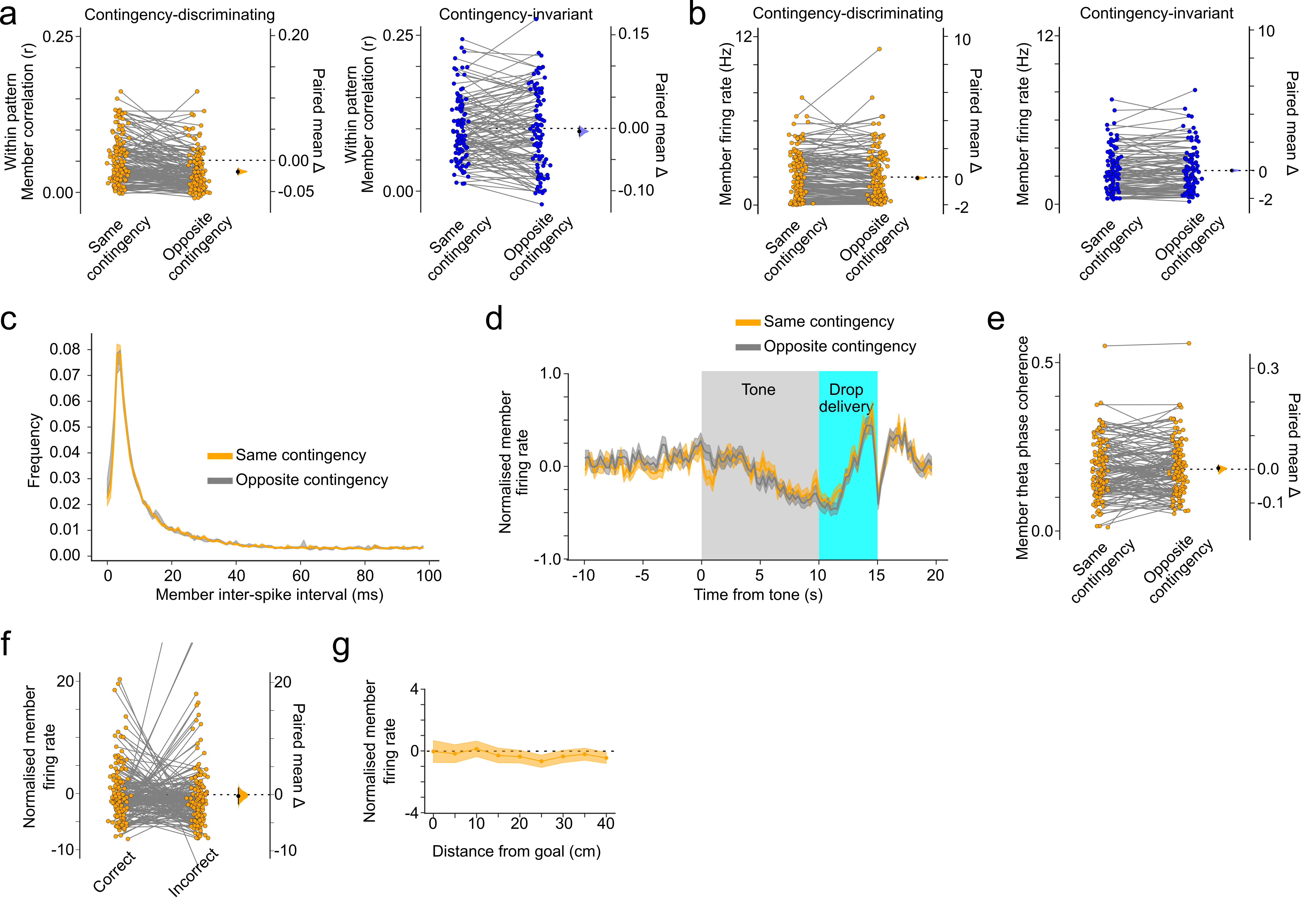 - Neural correlates of external variables provide potential internal codes that guide an animal’s behavior. Notably, first-order features of neural activity, such as single-neuron firing rates, have been implicated in encoding information. However, the extent to which higher-order features, such as multineuron coactivity, play primary roles in encoding information or secondary roles in supporting single-neuron codes remains unclear. Here, we show that millisecond-timescale coactivity among hippocampal CA1 neurons discriminates distinct, short-lived behavioral contingencies. This contingency discrimination was unrelated to the tuning of individual neurons, but was instead an emergent property of their coactivity. Contingency-discriminating patterns were reactivated offline after learning, and their reinstatement predicted trial-by-trial memory performance. Moreover, optogenetic suppression of inputs from the upstream CA3 region during learning impaired coactivity-based contingency information in the CA1 and subsequent dynamic memory retrieval. These findings identify millisecond-timescale coactivity as a primary feature of neural firing that encodes behaviorally relevant variables and supports memory retrieval.
