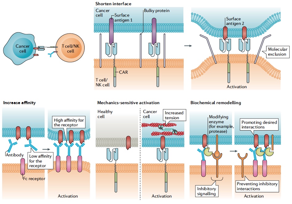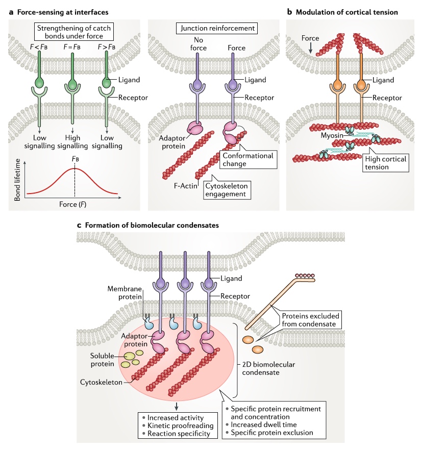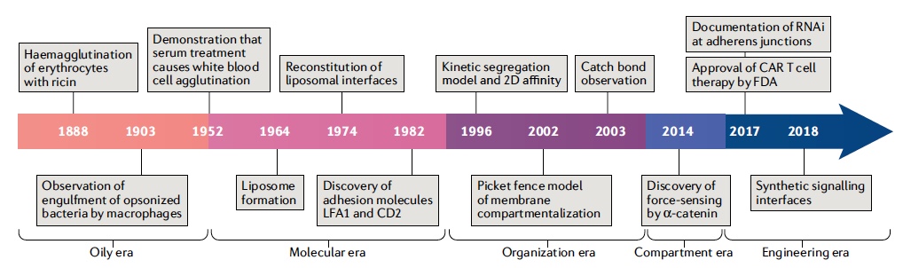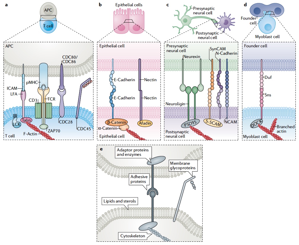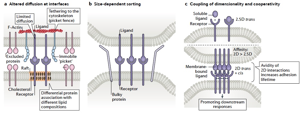 - Cell–cell interfaces are found throughout multicellular organisms, from transient interactions between motile immune cells to long-lived cell–cell contacts in epithelia. Studies of immune cell interactions, epithelial cell barriers, neuronal contacts and sites of cell–cell fusion have identified a core set of features shared by cell–cell interfaces that critically control their function. Data from diverse cell types also show that cells actively and passively regulate the localization, strength, duration and cytoskeletal coupling of receptor interactions governing cell–cell signalling and physical connections between cells, indicating that cell–cell interfaces have a unique membrane organization that emerges from local molecular and cellular mechanics. In this Review, we discuss recent findings that support the emerging view of cell–cell interfaces as specialized compartments that biophysically constrain the arrangement and activity of their protein, lipid and glycan components. We also review how these biophysical features of cell–cell interfaces allow cells to respond with high selectivity and sensitivity to multiple inputs, serving as the basis for wide-ranging cellular functions. Finally, we consider how the unique properties of cell–cell interfaces present opportunities for therapeutic intervention.