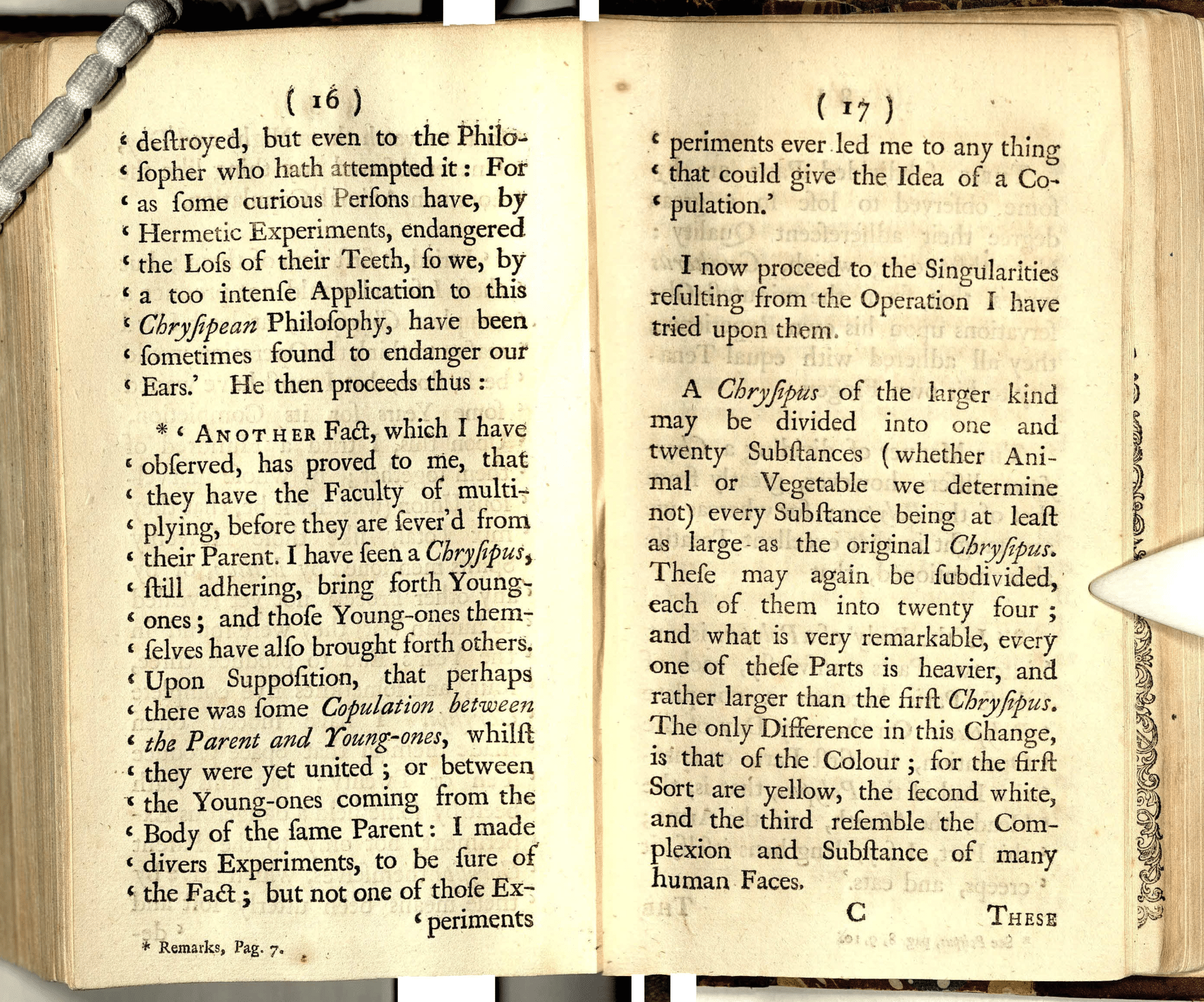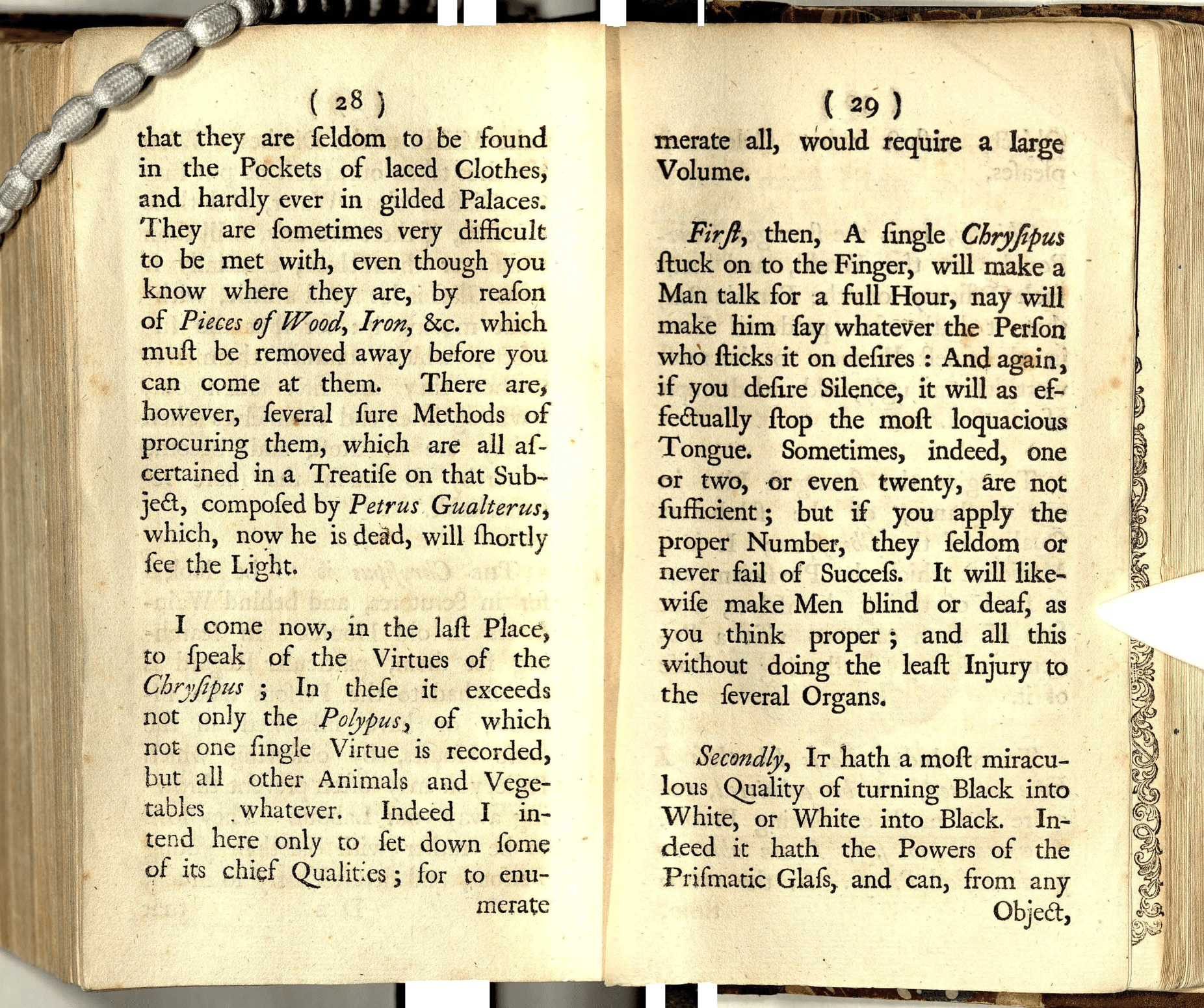 - This data set consists of 17 image files in PNG format, and an XML file. These files were created as part of a Digital Editions course, run by the Taylor Institution Library, during Hilary Term 2021. The course required participants to create a digitised version of a printed text. The full text is Henry Fielding's Some papers proper to be read before the R-l Society, concerning the terrestrial chrysipus, golden-foot or Guinea ... (London, 1743). It is held by Senate House Library (shelf mark [G.L.] 1743). The images of the original text were created by the Bodleian Libraries special collections mediated copying service. The XML file included here contains an encoded transcription of the original text, created and edited using Oxygen XML Editor, according to Text Encoding Initiative (TEI) guidelines.