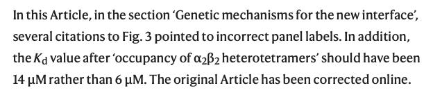 - Most proteins associate into multimeric complexes with specific architectures1,2, which often have functional properties such as cooperative ligand binding or allosteric regulation3. No detailed knowledge is available about how any multimer and its functions arose during evolution. Here we use ancestral protein reconstruction and biophysical assays to elucidate the origins of vertebrate haemoglobin, a heterotetramer of paralogous α- and β-subunits that mediates respiratory oxygen transport and exchange by cooperatively binding oxygen with moderate affinity. We show that modern haemoglobin evolved from an ancient monomer and characterize the historical ‘missing link’ through which the modern tetramer evolved—a noncooperative homodimer with high oxygen affinity that existed before the gene duplication that generated distinct α- and β-subunits. Reintroducing just two post-duplication historical substitutions into the ancestral protein is sufficient to cause strong tetramerization by creating favourable contacts with more ancient residues on the opposing subunit. These surface substitutions markedly reduce oxygen affinity and even confer cooperativity, because an ancient linkage between the oxygen binding site and the multimerization interface was already an intrinsic feature of the protein’s structure. Our findings establish that evolution can produce new complex molecular structures and functions via simple genetic mechanisms that recruit existing biophysical features into higher-level architectures.