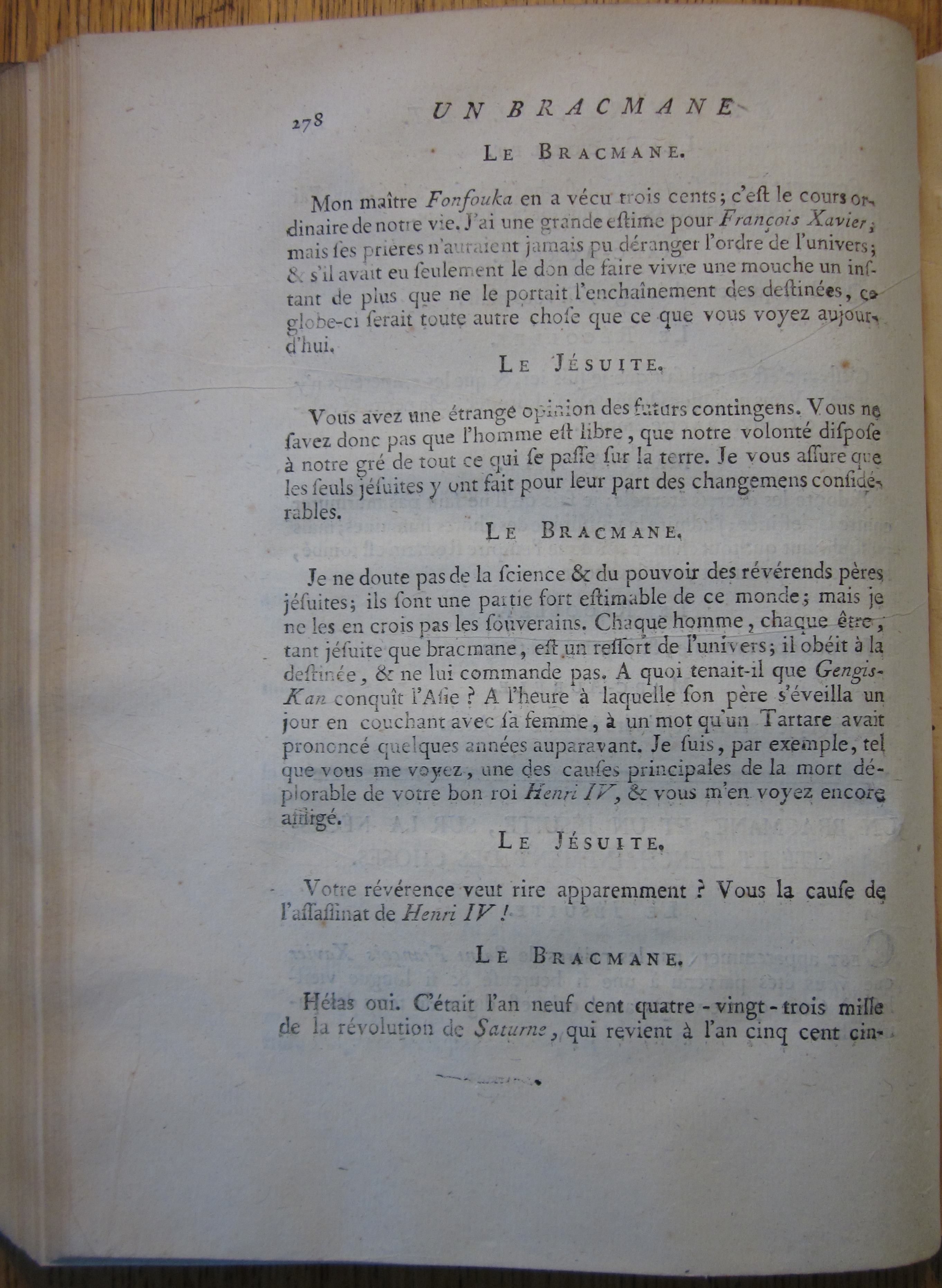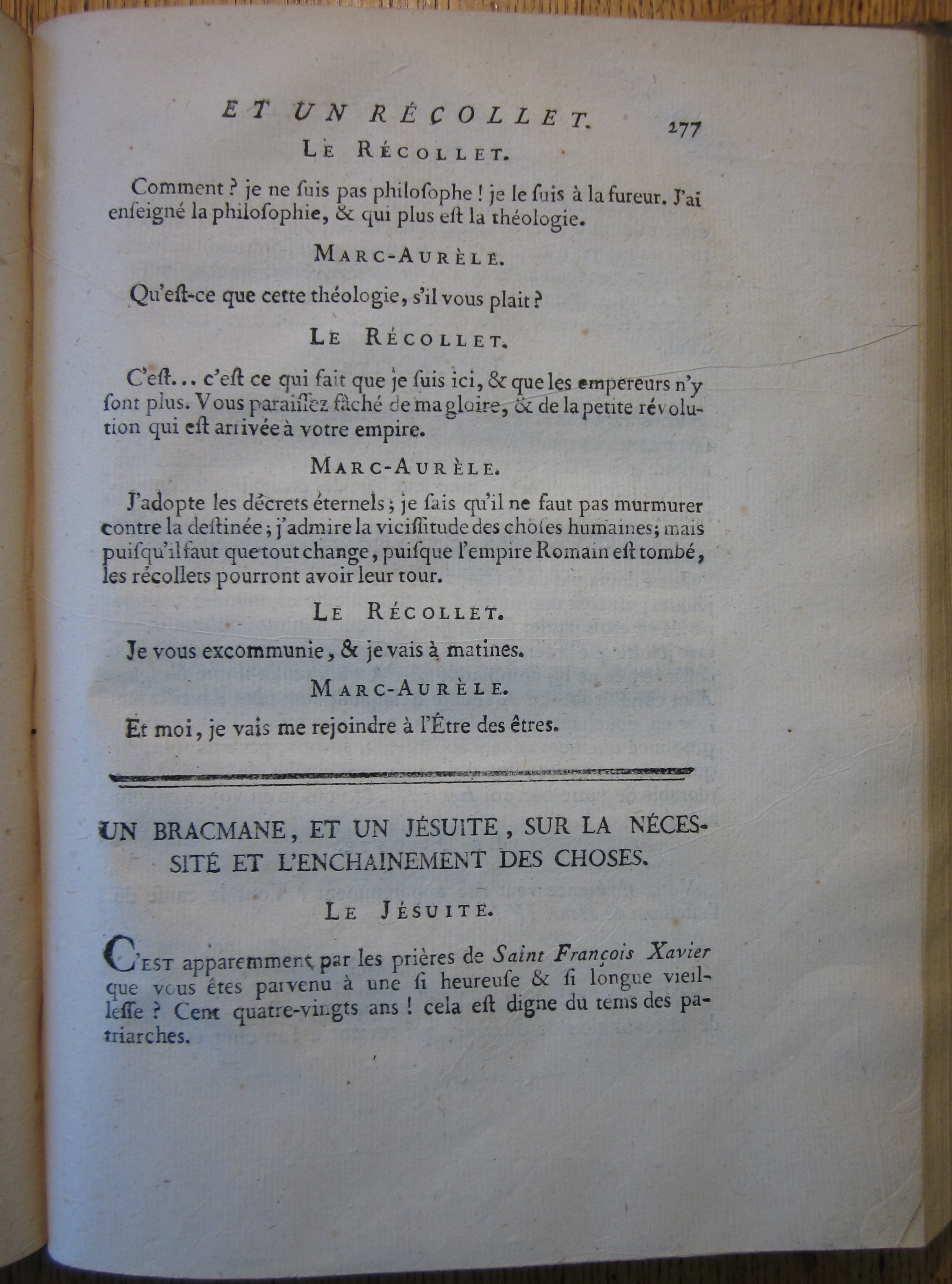 - This data set consists of image files in TIFF/PNG format and 2 XML files. These files were created as part of a Digital Editions course, run by the Taylor Institution Library, during Michaelmas Term 2018. The course required participants to create a digitised version of a printed text. This text is Voltaire's Dialogue entre un brahmane et un jésuite sur la nécessité et l'enchaînement des choses (Collection complète des Œuvres de Mr. de Voltaire: Mélanges de littérature, d'histoire et de philosophie. Geneva: Cramer, 1756, vol.4, pp.389-396). The images of the original text were created using a digital camera. The XML files included here contain an encoded transcription of the original text, created and edited using Oxygen XML Editor, according to Text Encoding Initiative (TEI) guidelines, as well as a modernised version of the text, and an English translation.