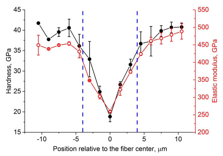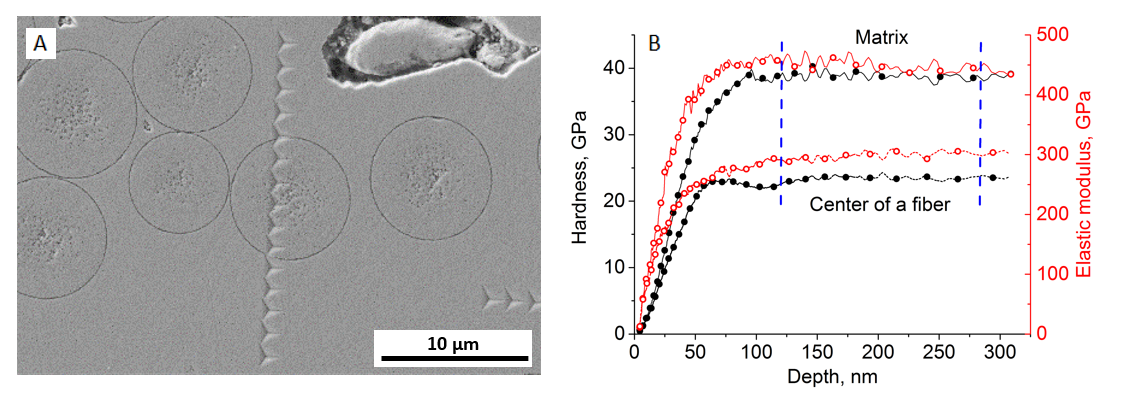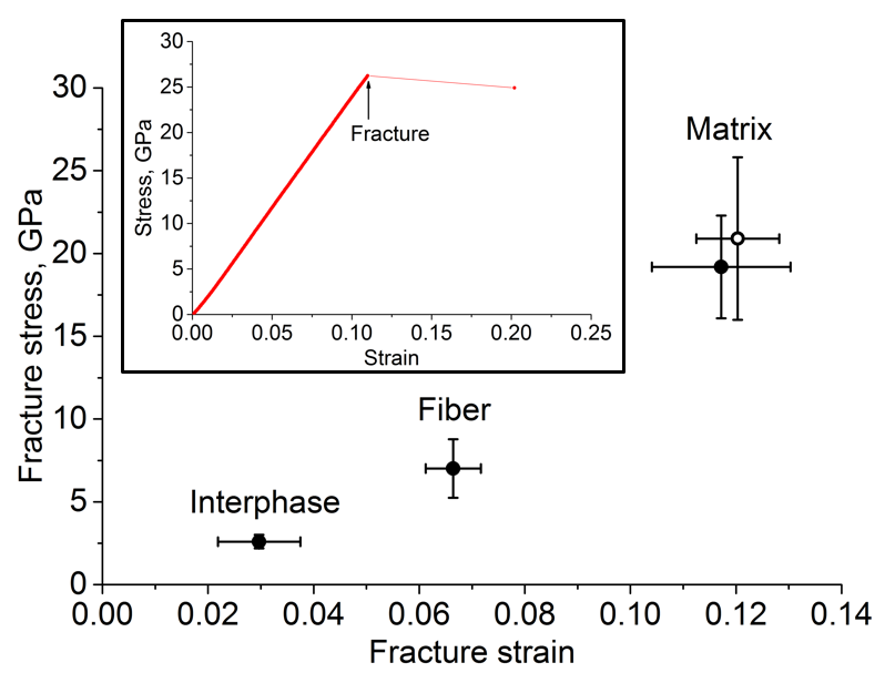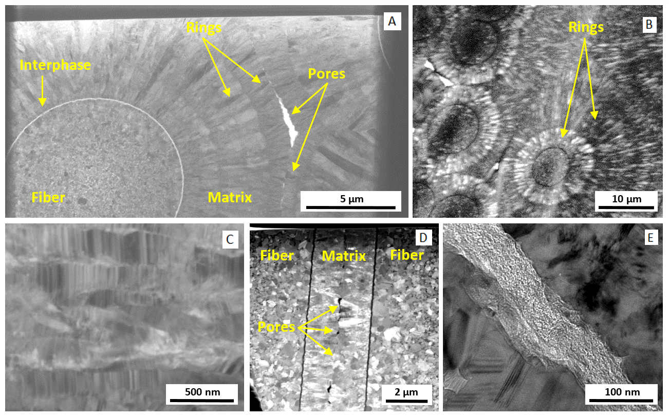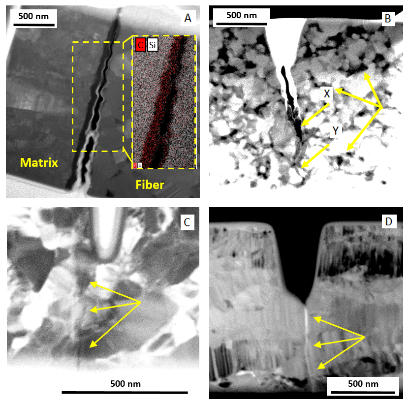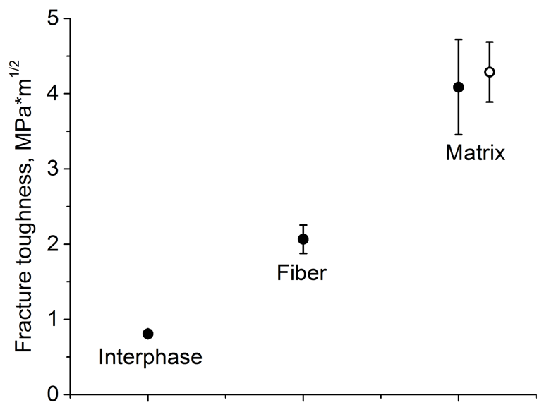 - Filenames correspond to the figures in the paper where the data are presented. Images (micrographs) are in png format, tabulated datasets are in xlsx format, TKD data file (containing Euler angles) is in ctf format, can be opened in Notepad. Local mechanical properties of SiC-SiC fiber-reinforced composite – matrix, fiber and interphases – were evaluated using nanoindentation and microcantilever fracture testing. The fracture toughness was found to be ~4.25 MPa*m1/2 in the matrix, ~2 MPa*m1/2 in the fibers and ~0.8 MPa*m1/2 at the interphases. Nanoindentation hardness was found to vary from ~17 GPa in the center of the fibers to ~40 GPa in the matrix. Values obtained with micromechanical testing were found to be in good agreement with the available data on bulk mechanical properties. The mechanical property variations in the different components of the composite can be explained by the variations in the microstructure. The matrix has complex hierarchical microstructure with elongated grains, often featuring twinning, growing radially from the fibers in predominantly <111> direction and forming sets of concentric rings around them. The fibers contain equiaxed grains with carbon precipitates at the grain boundaries. It was found that in the matrix fracture is transgranular, while in the fibers it can be both trans- and intergranular; at the interphases the fracture occurs at the carbon-fiber boundary. The differences in mechanical properties between the matrix and the fibers are attributed to the presence of carbon inclusions in the fibers, which reduce both hardness and fracture toughness.