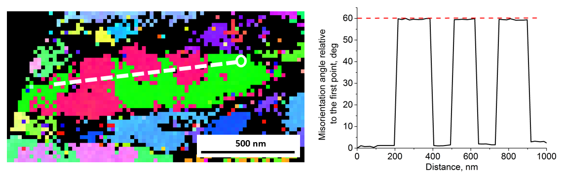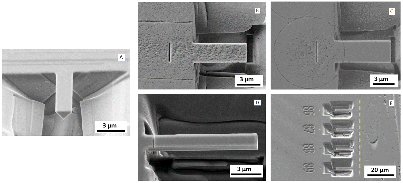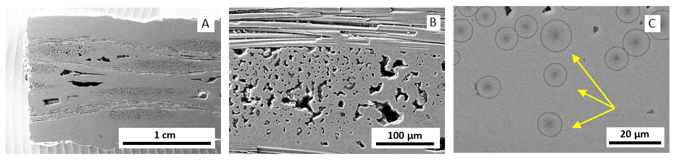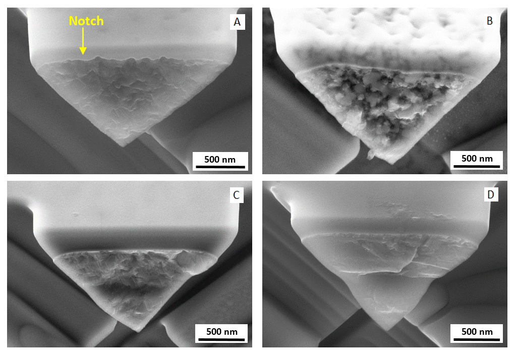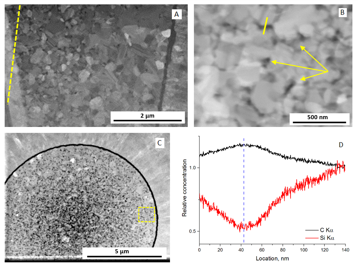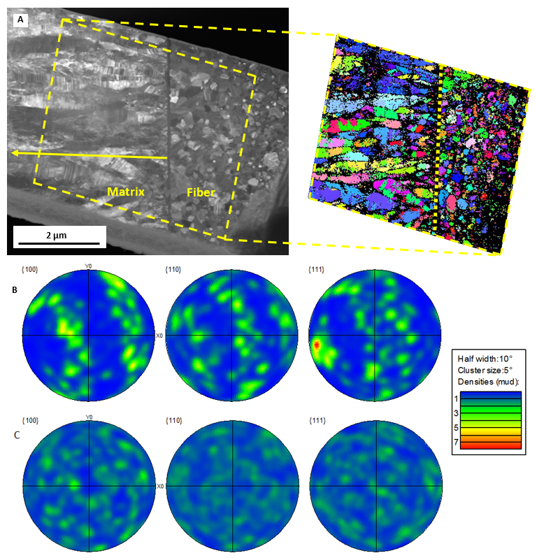 - Filenames correspond to the figures in the paper where the data are presented. Images (micrographs) are in png format, tabulated datasets are in xlsx format, TKD data file (containing Euler angles) is in ctf format, can be opened in Notepad. Local mechanical properties of SiC-SiC fiber-reinforced composite – matrix, fiber and interphases – were evaluated using nanoindentation and microcantilever fracture testing. The fracture toughness was found to be ~4.25 MPa*m1/2 in the matrix, ~2 MPa*m1/2 in the fibers and ~0.8 MPa*m1/2 at the interphases. Nanoindentation hardness was found to vary from ~17 GPa in the center of the fibers to ~40 GPa in the matrix. Values obtained with micromechanical testing were found to be in good agreement with the available data on bulk mechanical properties. The mechanical property variations in the different components of the composite can be explained by the variations in the microstructure. The matrix has complex hierarchical microstructure with elongated grains, often featuring twinning, growing radially from the fibers in predominantly <111> direction and forming sets of concentric rings around them. The fibers contain equiaxed grains with carbon precipitates at the grain boundaries. It was found that in the matrix fracture is transgranular, while in the fibers it can be both trans- and intergranular; at the interphases the fracture occurs at the carbon-fiber boundary. The differences in mechanical properties between the matrix and the fibers are attributed to the presence of carbon inclusions in the fibers, which reduce both hardness and fracture toughness.