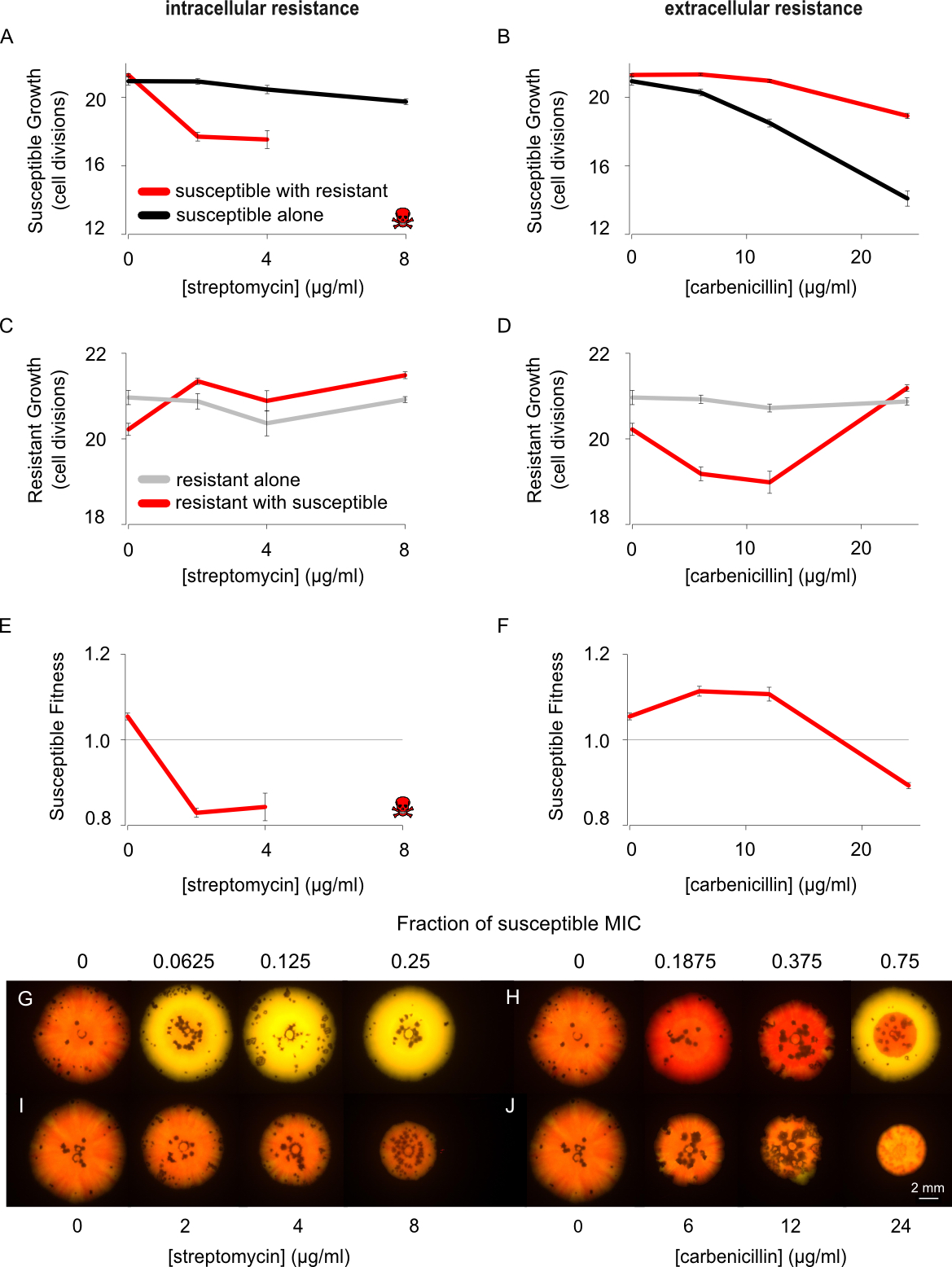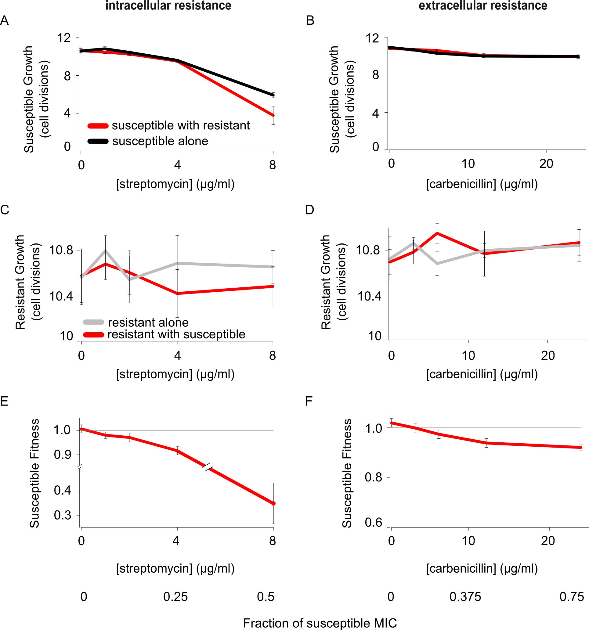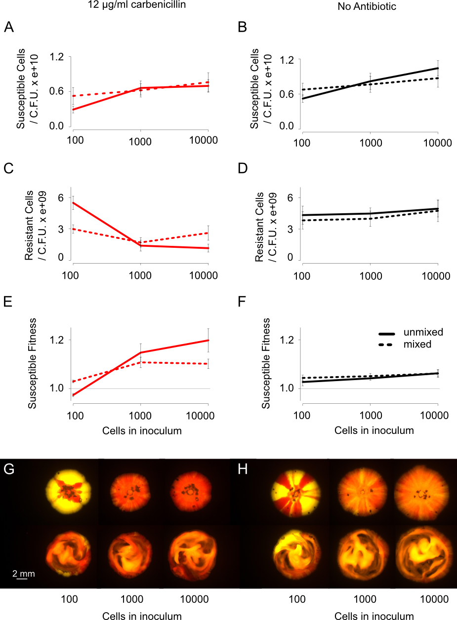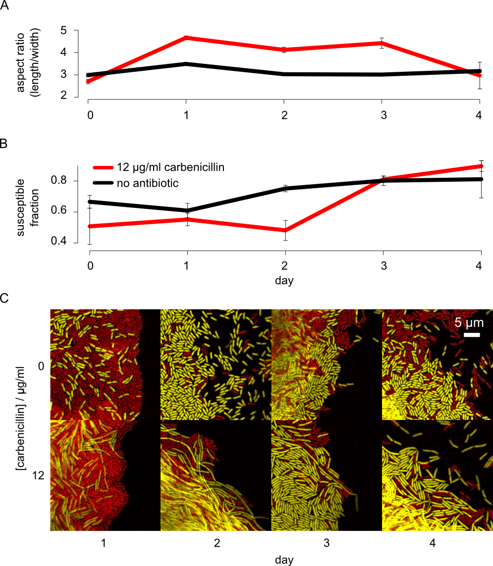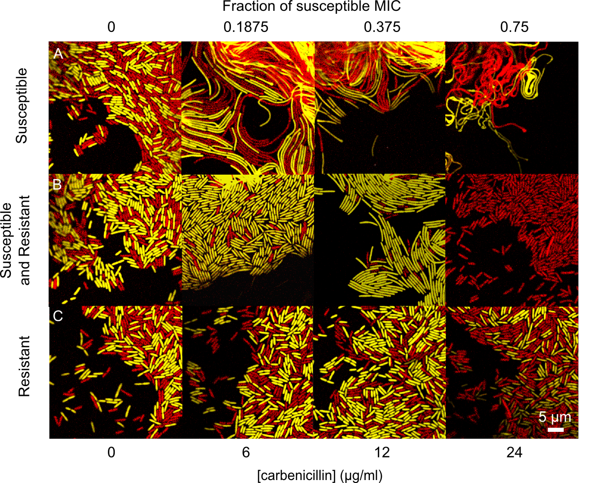 - Bacteria commonly live in dense and genetically-diverse communities associated with surfaces. In these communities, competition for resources and space is intense, and yet we understand little of how this affects the spread of antibiotic resistant strains. Here we study interactions between antibiotic resistant and susceptible strains using in vitro competition experiments in the opportunistic pathogen Pseudomonas aeruginosa and in silico simulations. Selection for intracellular resistance to streptomycin is very strong in colonies, such that resistance is favoured at very low antibiotic doses. In contrast, selection for extracellular resistance to carbenicillin is weak in colonies, and high doses of antibiotic are required to select for resistance. Manipulating the density and spatial structure of colonies reveals that this difference is partly explained by the fact that the local degradation of carbenicillin by β-lactamase secreting cells protects neighbouring sensitive cells from carbenicillin. In addition, we discover a second unexpected effect: the inducible elongation of cells in response to carbenicillin allows sensitive cells to better compete for the rapidly growing colony edge. These combined effects mean that antibiotic treatment can select against antibiotic resistant strains, raising the possibility of treatment regimes that suppress sensitive strains while limiting the rise of antibiotic resistance. We argue that the detailed study of bacterial interactions will be fundamental to understanding and overcoming antibiotic resistance.